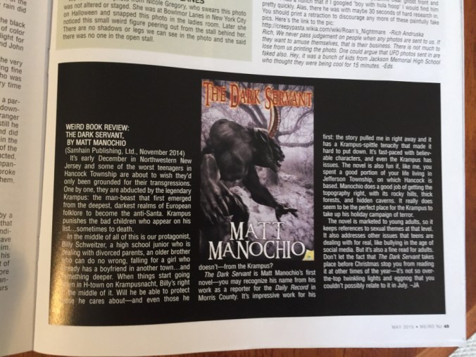I reviewed Matt Manochio’s The Dark Servant in Issue #44 of Weird NJ and was poking around the Internet (okay, Googling my name) when I came across a thank you post on his blog: