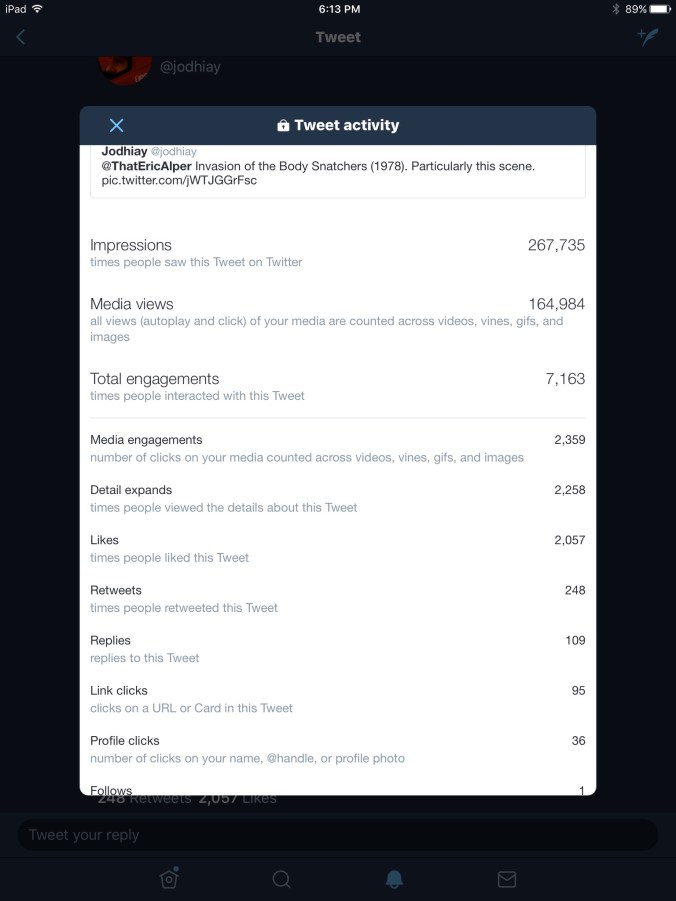 I responded to Eric’s post and went away for a bit. And then I came back to my iPad and saw my Twitter notifications were more active than they usually were. A lot more active.Someone made a Twitter moment of the question and some of the responses, including mine. And since mine had a gif, and was really freaky and long forgotten/never seen by many, it blew up. Not like millions of impressions blowing up, but enough.These were the results a day or so later: